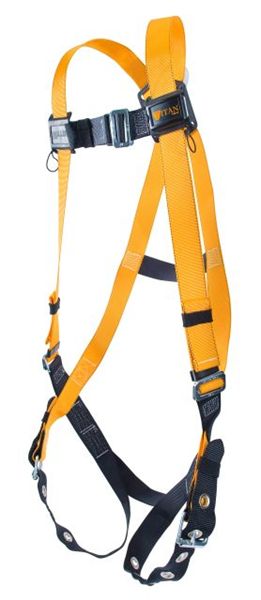 Full body harnesses feature a sliding back D-ring which keeps worker in an upright position in the event of a fall. Lightweight, durable webbing provides all day comfort and dependability. Available in standard or stretch. Universal sizing fits most. All Titan harnesses meet applicable OSHA, ANSI and CSA standards. Rated at 310 lbs.